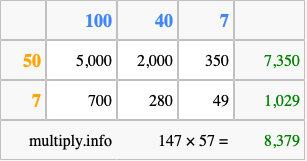 That's all there is to it! As you can see from the box above, the answer to 147 times 57 using the box method is 8,379.