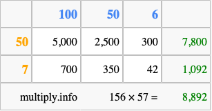 That's all there is to it! As you can see from the box above, the answer to 156 times 57 using the box method is 8,892.