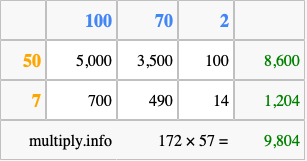 Below is an illustration showing you how to calculate 172 times 57 using the box method, using the instructions above.