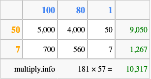 Below is an illustration showing you how to calculate 181 times 57 using the box method, using the instructions above.