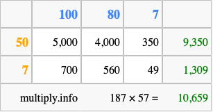 Below is an illustration showing you how to calculate 187 times 57 using the box method, using the instructions above.