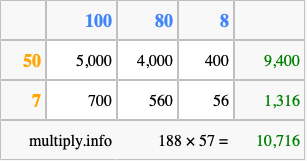 Finally, we add up all the sums we found in step 3 to get our final answer to 188 times 57.