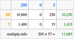 Finally, we add up all the sums we found in step 3 to get our final answer to 205 times 57.