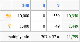 That's all there is to it! As you can see from the box above, the answer to 207 times 57 using the box method is 11,799.