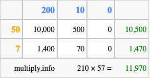 Below is an illustration showing you how to calculate 210 times 57 using the box method, using the instructions above.
