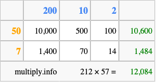 That's all there is to it! As you can see from the box above, the answer to 212 times 57 using the box method is 12,084.