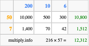 Below is an illustration showing you how to calculate 216 times 57 using the box method, using the instructions above.