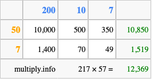 Below is an illustration showing you how to calculate 217 times 57 using the box method, using the instructions above.