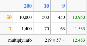Below is an illustration showing you how to calculate 219 times 57 using the box method, using the instructions above.