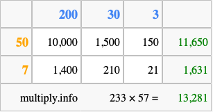 Below is an illustration showing you how to calculate 233 times 57 using the box method, using the instructions above.