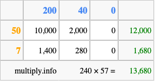 That's all there is to it! As you can see from the box above, the answer to 240 times 57 using the box method is 13,680.