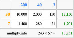 Finally, we add up all the sums we found in step 3 to get our final answer to 243 times 57.