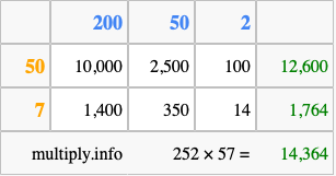That's all there is to it! As you can see from the box above, the answer to 252 times 57 using the box method is 14,364.