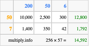 That's all there is to it! As you can see from the box above, the answer to 256 times 57 using the box method is 14,592.
