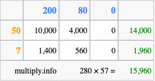 Finally, we add up all the sums we found in step 3 to get our final answer to 280 times 57.