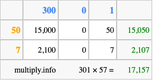 That's all there is to it! As you can see from the box above, the answer to 301 times 57 using the box method is 17,157.