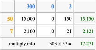 That's all there is to it! As you can see from the box above, the answer to 303 times 57 using the box method is 17,271.