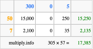 Finally, we add up all the sums we found in step 3 to get our final answer to 305 times 57.