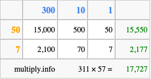 Finally, we add up all the sums we found in step 3 to get our final answer to 311 times 57.