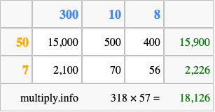 Finally, we add up all the sums we found in step 3 to get our final answer to 318 times 57.