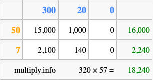 That's all there is to it! As you can see from the box above, the answer to 320 times 57 using the box method is 18,240.