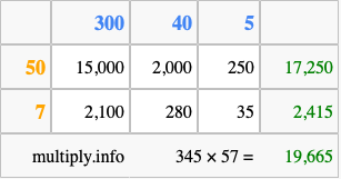 Finally, we add up all the sums we found in step 3 to get our final answer to 345 times 57.