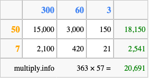 Finally, we add up all the sums we found in step 3 to get our final answer to 363 times 57.