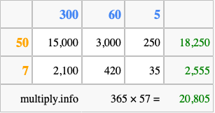 Finally, we add up all the sums we found in step 3 to get our final answer to 365 times 57.