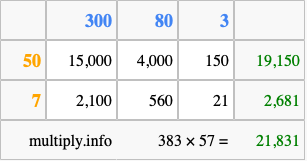 That's all there is to it! As you can see from the box above, the answer to 383 times 57 using the box method is 21,831.