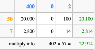 That's all there is to it! As you can see from the box above, the answer to 402 times 57 using the box method is 22,914.