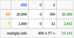 That's all there is to it! As you can see from the box above, the answer to 406 times 57 using the box method is 23,142.