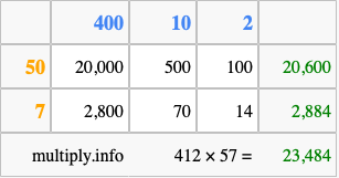 Finally, we add up all the sums we found in step 3 to get our final answer to 412 times 57.