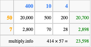 Finally, we add up all the sums we found in step 3 to get our final answer to 414 times 57.