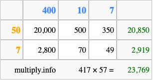 Finally, we add up all the sums we found in step 3 to get our final answer to 417 times 57.