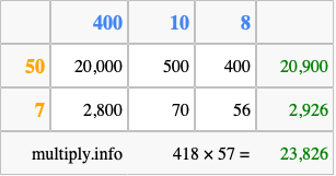 Finally, we add up all the sums we found in step 3 to get our final answer to 418 times 57.