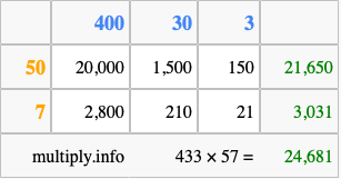 That's all there is to it! As you can see from the box above, the answer to 433 times 57 using the box method is 24,681.