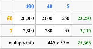 Finally, we add up all the sums we found in step 3 to get our final answer to 445 times 57.