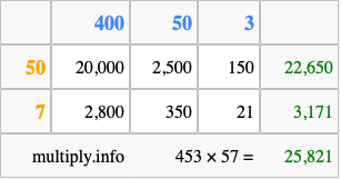 Finally, we add up all the sums we found in step 3 to get our final answer to 453 times 57.