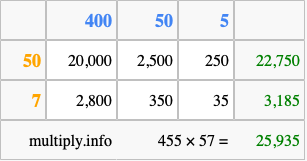 That's all there is to it! As you can see from the box above, the answer to 455 times 57 using the box method is 25,935.