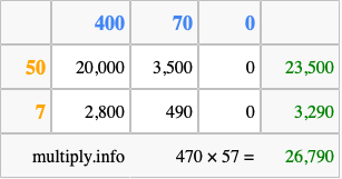 That's all there is to it! As you can see from the box above, the answer to 470 times 57 using the box method is 26,790.