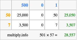 That's all there is to it! As you can see from the box above, the answer to 501 times 57 using the box method is 28,557.