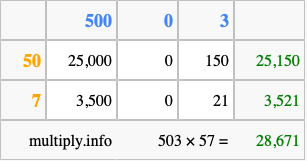 That's all there is to it! As you can see from the box above, the answer to 503 times 57 using the box method is 28,671.