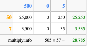 That's all there is to it! As you can see from the box above, the answer to 505 times 57 using the box method is 28,785.