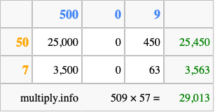That's all there is to it! As you can see from the box above, the answer to 509 times 57 using the box method is 29,013.