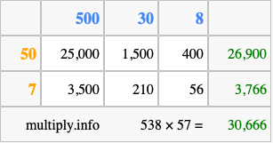 That's all there is to it! As you can see from the box above, the answer to 538 times 57 using the box method is 30,666.