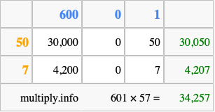 That's all there is to it! As you can see from the box above, the answer to 601 times 57 using the box method is 34,257.