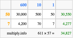 That's all there is to it! As you can see from the box above, the answer to 611 times 57 using the box method is 34,827.