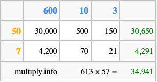 That's all there is to it! As you can see from the box above, the answer to 613 times 57 using the box method is 34,941.