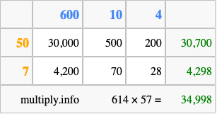 That's all there is to it! As you can see from the box above, the answer to 614 times 57 using the box method is 34,998.