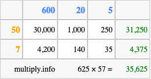 Below is an illustration showing you how to calculate 625 times 57 using the box method, using the instructions above.